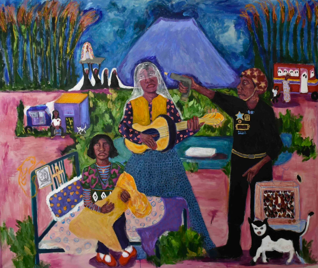 Comencé trabajando esta obra con pintura spray, pero luego empecé a pintar por encima con acrílicos. Tenía pensado que en la composición final se vieran muchas de estas partes con spray, pero comencé a pintar en acrilicos y pasteles y ya la obra cambió. Fui pintando más y más, y más la retoqué muchísimas veces, estando en Lisboa y Nueva York. La intervine estando aquí en Perú, le agregué mucho más color, al inicio no había tanto verde, por ejemplo, agregué más y así fui pintando más personas dentro del cuadro y la narrativa creció…