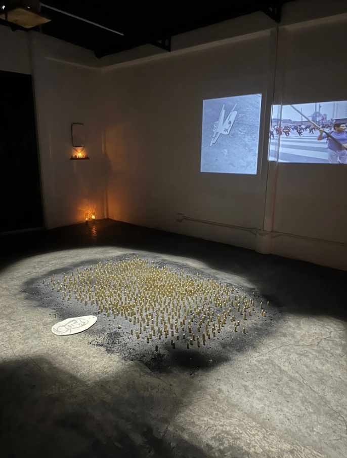 Bueno, sí. Este proyecto de las balas fue político. Hable sobre el estado de violencia que vivimos desde hace años en el país. Era una instalación que consistía en un piso de cenizas hechas con los periódicos quemados, que contenían noticias sobre los asesinatos en el país. Sobre el piso de cenizas coloque cientos de balas hechas de cerámica, todas a mano.